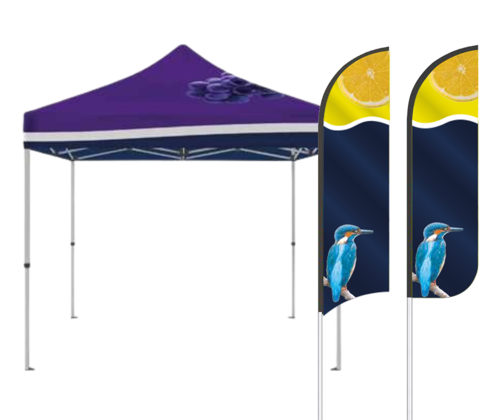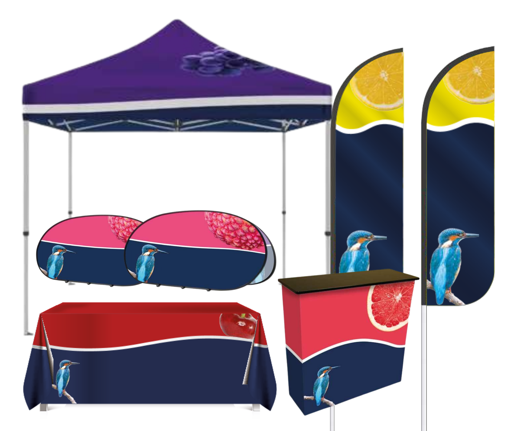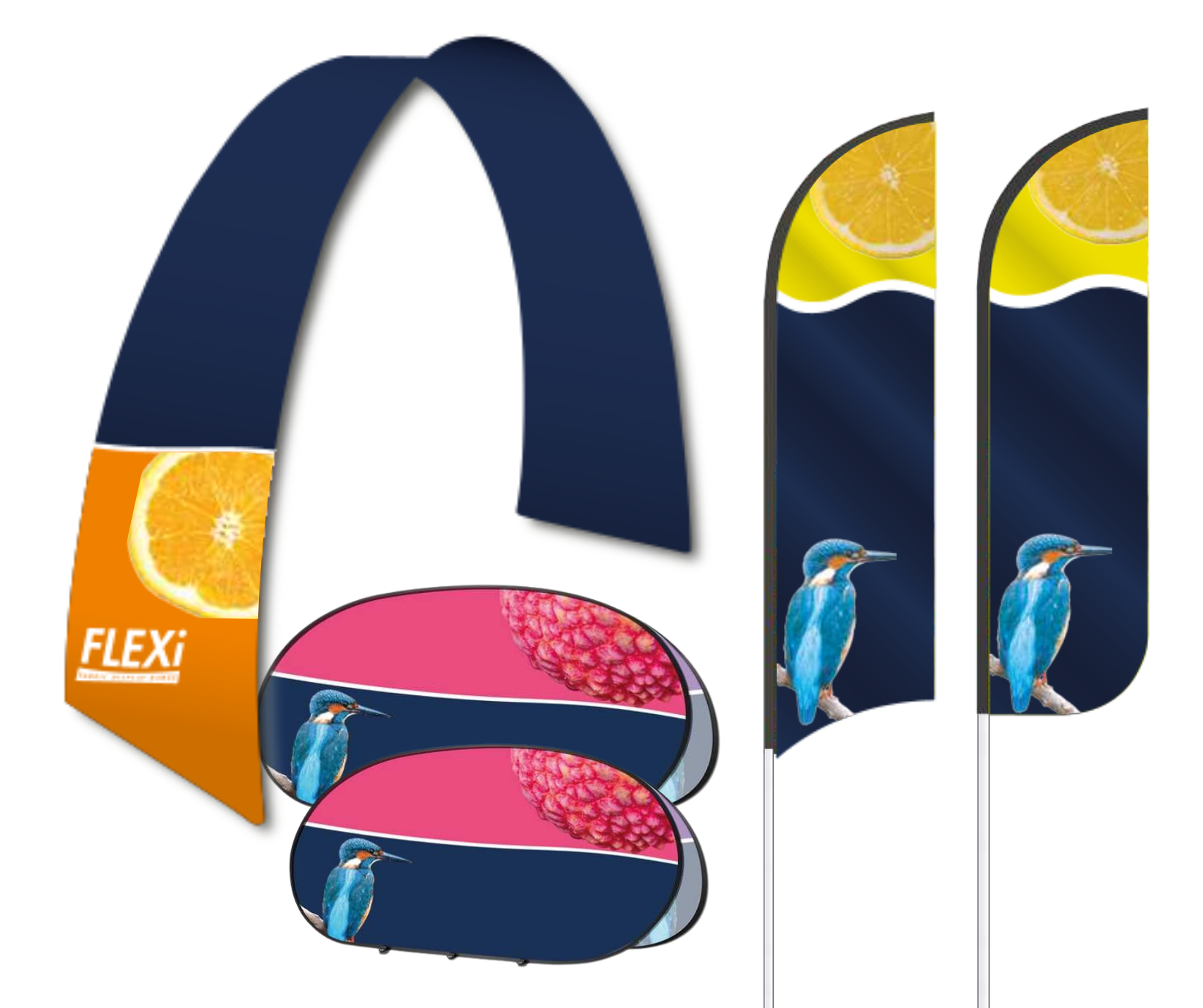 A: Some products are suitable for outdoor use (event tents, feather flags, pop-out banners, PVC counters). Fabric displays like FLEXi systems and roller banners are designed for indoor exhibitions. For outdoor events, choose products specifically rated for outdoor use and consider wind conditions.